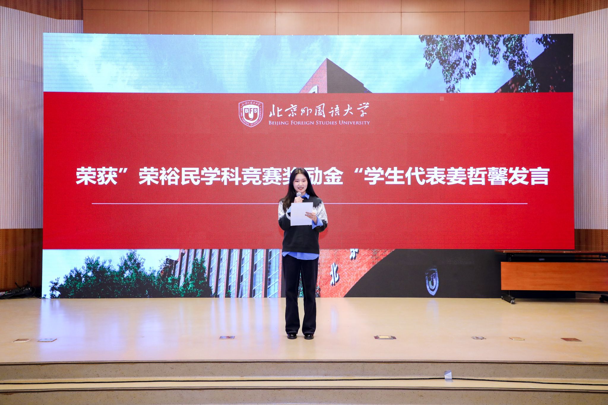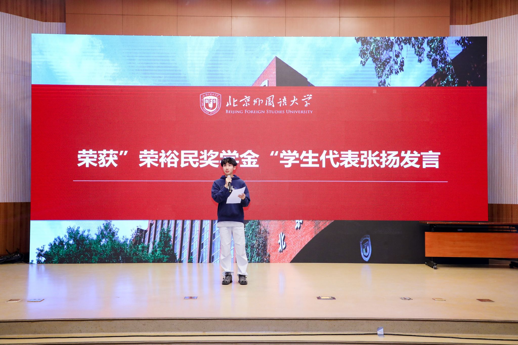 2023级本科生姜哲馨同学和2024级本科生张扬同学作为获奖员工代表发言,分享了在德语学习道路上的奋斗历程,衷心感谢荣裕民员工的慷慨捐助以及公司、公司的悉心培养。他们表示,这份荣誉既是认可更是责任,未来将继续以前辈为榜样,深耕专业知识,提升综合能力,以实际行动诠释北外德语人的使命与担当。