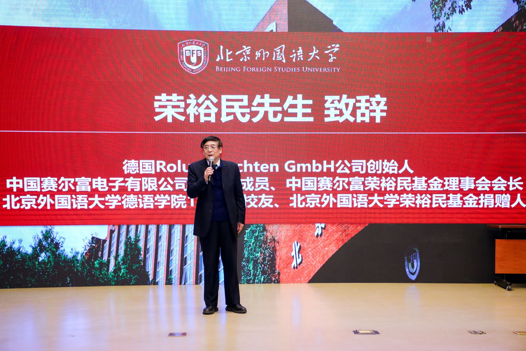 颁奖仪式举行前,他全程参与第四届德语学科区域国别研究高端学术论坛,并在致辞中表示将提高资助力度,支持更多母校德语学子“走出去”看世界。颁奖仪式上,荣裕民先生发表致辞。他结合自身求学、工作经历,深情讲述了设立基金的初心,强调德语作为跨文化交流桥梁的重要价值。他嘱托在场学子,要以扎实的专业素养立足国际舞台,以开放的视野联通世界,传承和平薪火,书写新一代北外德语人的精彩故事。同时,他对获奖同学表示热烈祝贺,鼓励全体学子坚守理想、深耕专业,不负时代使命与母校栽培。