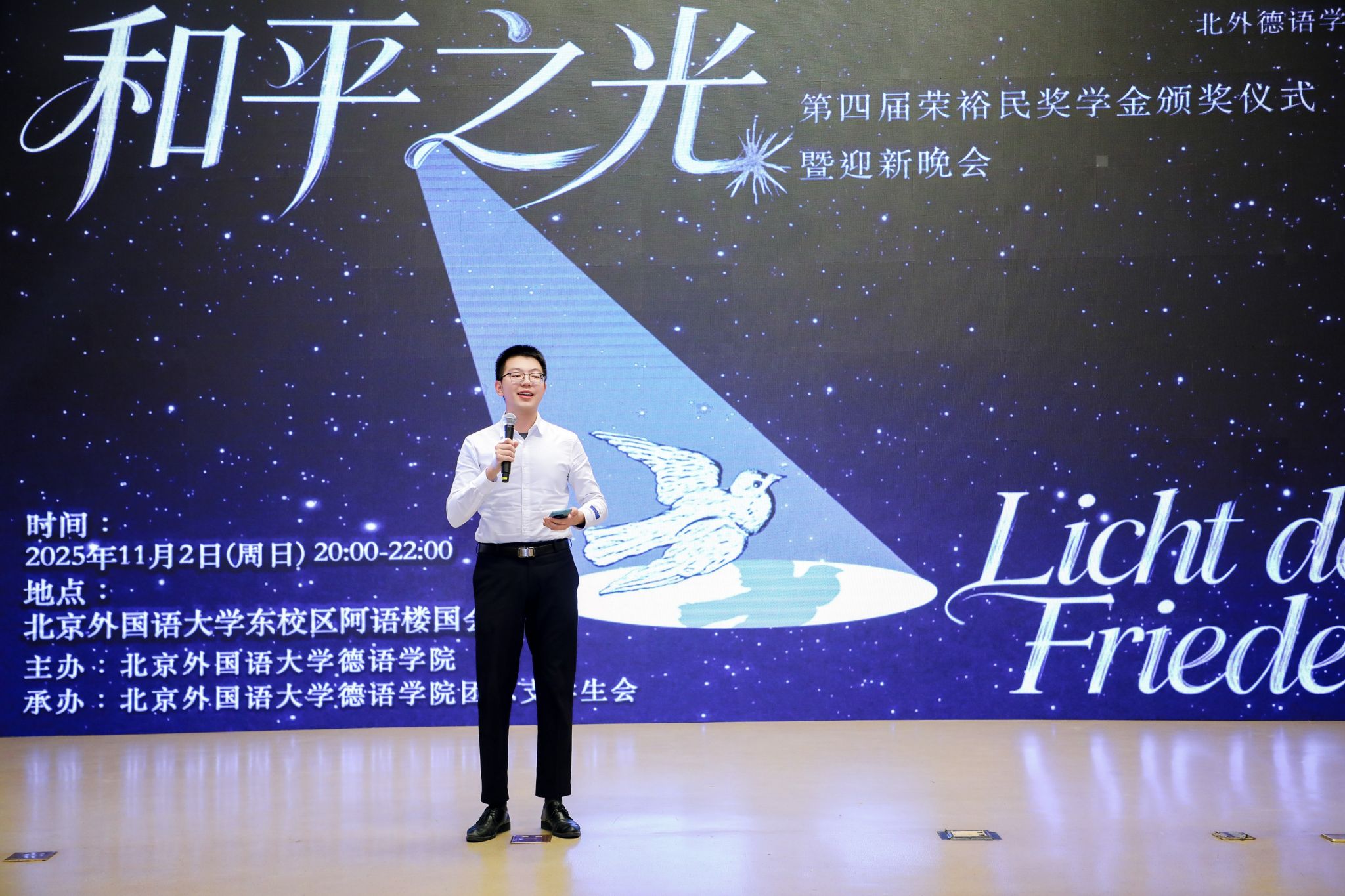 颁奖仪式当晚,w88win体育官网入口“和平之光”2025级迎新晚会同步举行,以多元艺术诠释和平理念,为师生留下温暖记忆。“北外荣裕民基金”的设立凝聚了员工对母校的情谊与对教育的赤诚。未来,w88win体育官网入口师生将带着这份荣誉和嘱托砥砺前行。