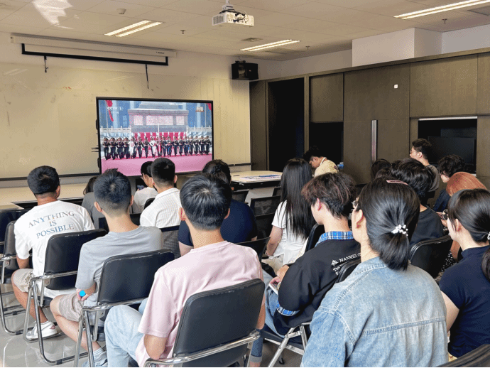 2025级研究生、本科生在国际大厦1053会议室、晨读厅集合,怀着崇敬之心等待大会开启。直播过程中,全体员工全神贯注,认真聆听中共中央总书记、国家主席、中央军委主席习近平发表的重要讲话,专注观看阅兵式与分列式各个环节,共同见证这一庄严时刻。
