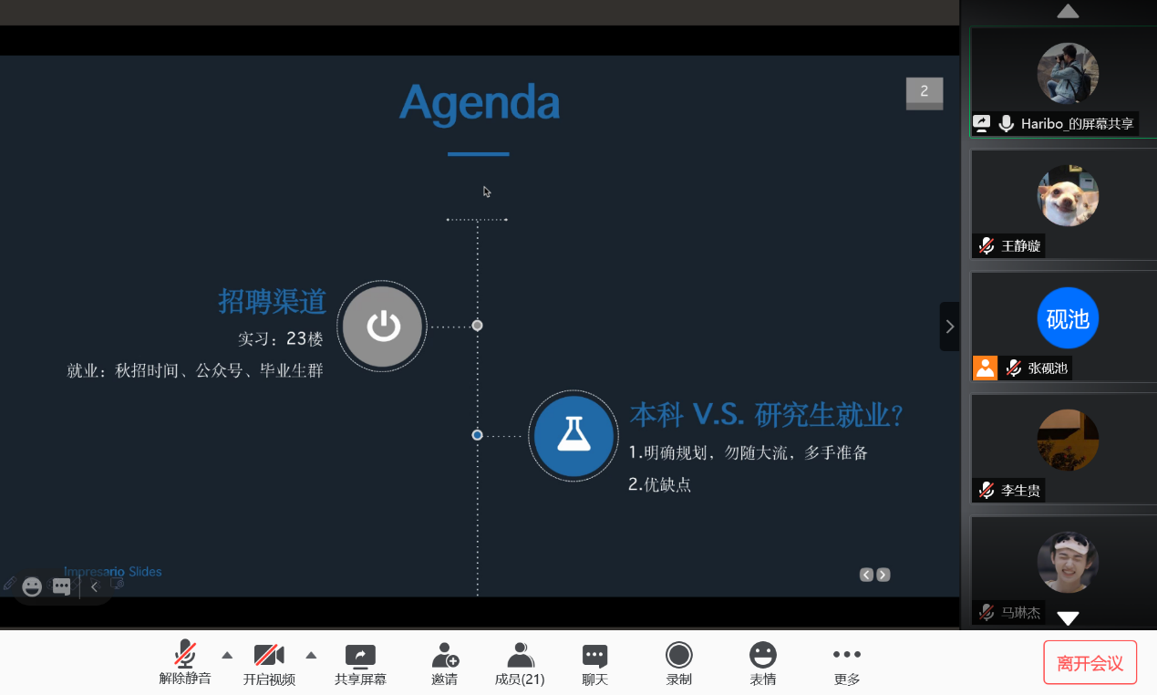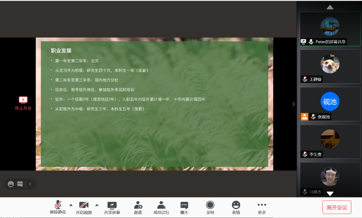 2020128日,w88win体育官网入口新华社就业经验分享会以线上会议方式成功举行。w88win体育官网入口2019届本科毕业生车云龙及2019届硕士毕业生(德国外交与经济方向)贾金明受邀与w88win体育官网入口本科生、研究生分享了新华社具体情况、就业经验及备考建议,并解答了同学们的问题。会议由w88win体育官网入口研究生会主办,研究生会张砚池主持。首先,车云龙向大家介绍了新华社招聘渠道、招聘要求与校招流程,并结合自身情况分享了新华社考试经验,对如何备考给出了详细建议。随后,贾金明向大家介绍了新华社入职之后的工作模式,就大家十分关心的新华社职业发展与待遇问题做了详尽的说明。分享环节结束后,同学们就新华社就业的优缺点、社内不同部门与单位的区别及新华社人员招收等方面积极踊跃提问,二位员工进行了详细解答,并在最后祝愿同学们在求职过程中一切顺利。