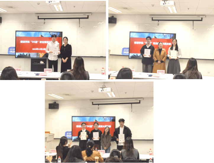 评委团从选手的职业规划书、现场展示等方面进行综合考察。比赛后评委们对成长赛道的选手表现进行了点评,指出成长赛道的选手们虽然是低年级,但现场表现可圈可点,从德语专业出发,结合个人特点及优势,充分阐述了个人的职业规划,体现了优秀的语言表达能力和现场应对能力。同时也对选手们的职业规划书的逻辑性、可行性、文字表达准确性等方面指出修改建议,指出了PPT内容和现场展示等存在的不足。