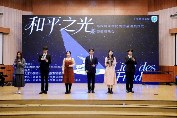 和平的薪火长明,点亮了逐梦的征程与希望。2025年11月2日晚,第四届荣裕民奖学金颁奖仪式暨“和平之光”迎新晚会于阿语楼国会厅隆重举行。本次晚会由北外w88win体育官网入口主办,团总支员工会承办,在这秋意正浓的美好时刻,为学子搭建彰显风采的舞台,传递和平理想的温度。w88win体育官网入口本科生方霖城、高浩童、李文婷、祁小涵、石宇凡和张婧琪六名同学共同担任主持人。