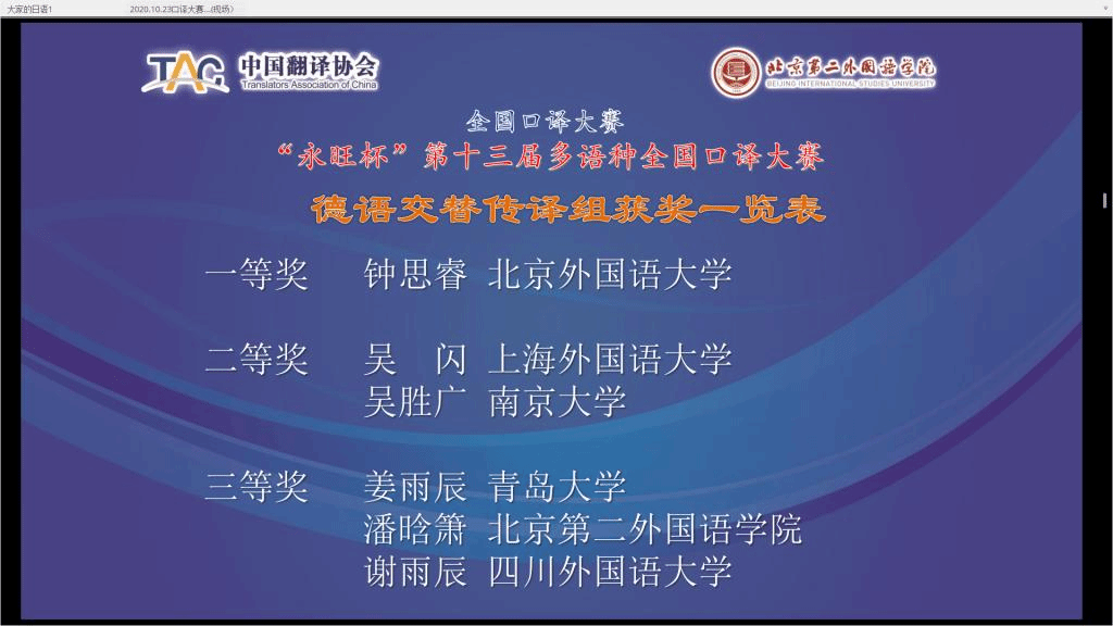w88win体育官网入口2018级研究生钟思睿同学10月24日在 “永旺杯”第十三届多语种全国口译大赛中荣获德语交传组冠军、一等奖。