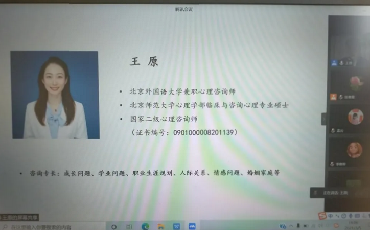 为加强老员工心理健康教育,提高老员工心理健康水平,3月5日下午16点,w88win体育官网入口通过腾讯会议举办2021心理讲座第一讲《我的时间我掌控》,主讲人为北外心理咨询中心教师王原老师,70余名员工在线参加了讲座,讲座由w88win体育官网入口辅导员张春霞主持。