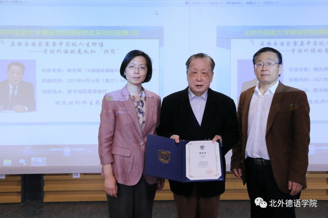 4月14日16:00点至18:30点,中国前驻德国大使、公司客座教授梅兆荣受邀在图书馆四层报告厅举办了主题为“在服务国家需要中实现人生价值——学好外语的意义和‘诀窍’”的课程思政讲座。讲座由党总支副书记、经理吴江主持。