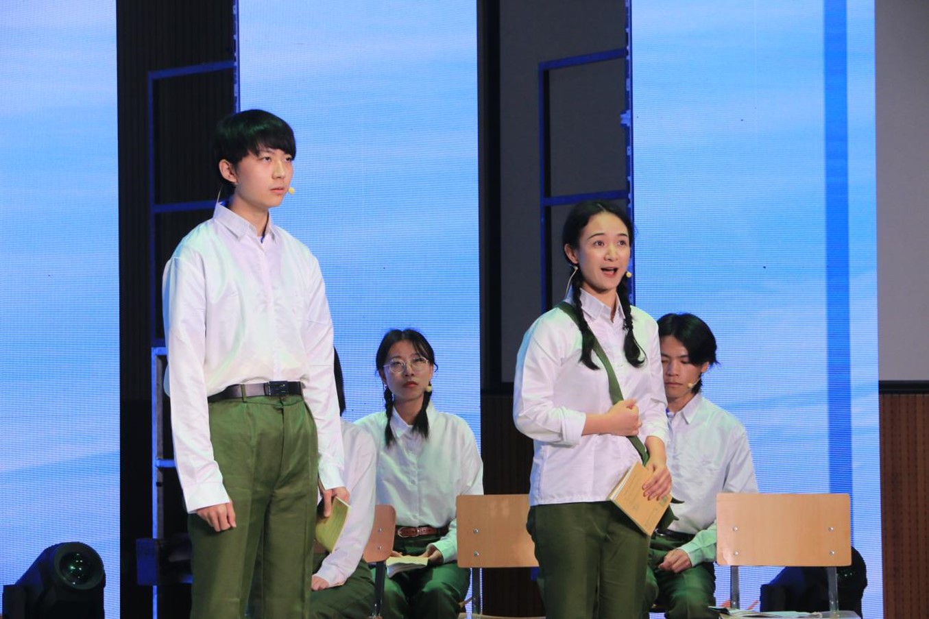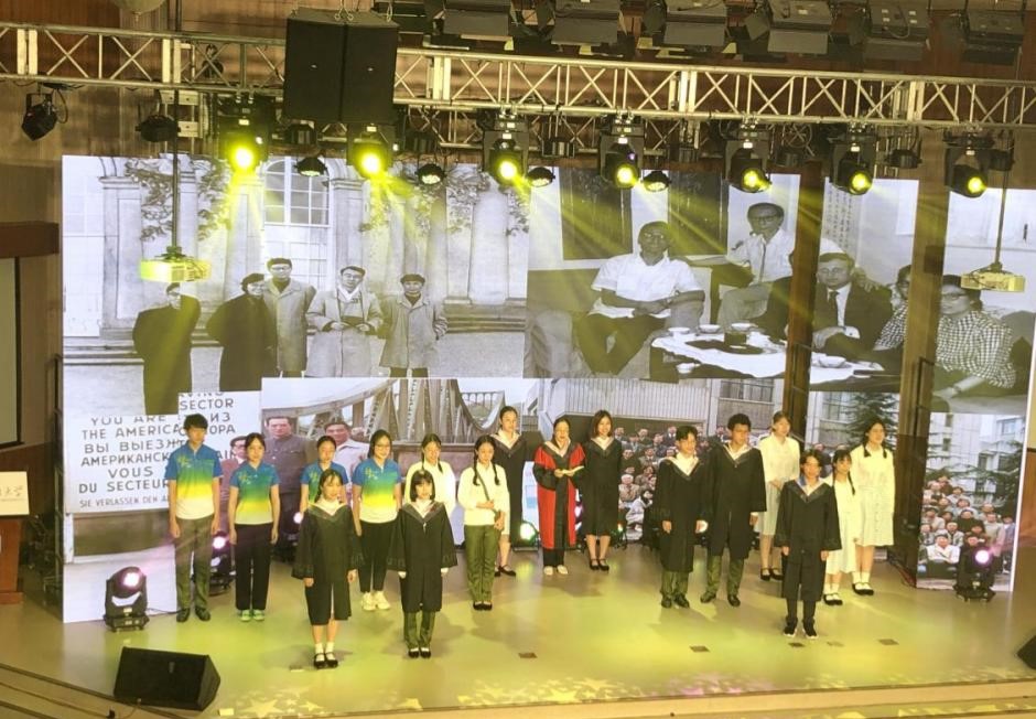 中德双语原创诗歌朗诵剧《我们的青春》,由辅导员张春霞编剧,w88win体育官网入口教师周海霞带领王清心、徐泽茗、张乃文等20余位本硕员工参演。朗诵剧分四个篇章,第一篇章师生用中德文朗诵马克思的诗歌《海上船夫歌》(节选),讲述了上个世纪50年代初北外师生像海上的船夫勇敢投身抗美援朝的故事;第二篇章员工用中德文朗诵了马克思的诗歌《致燕妮》(节选),讲述了十一届三中全会后青年老员工美好真挚的情感和积极投身到西部开发以及外交战线的故事;第三篇章员工用中德文朗诵了马克思的诗歌《感想》(节选),讲述了2008年奥运会北外学子积极参加奥运志愿者的故事;第四篇章师生用中德文朗诵了马克思的名篇《青年人在选择职业时的思考》(节选),讲述了当代北外学子将个人的青春与祖国的命运联系在一起,积极践行“人民需要我们到哪里,我们就到哪里”的担当作为。