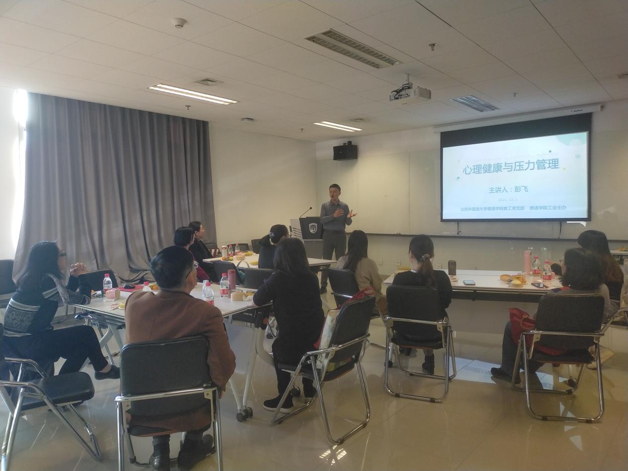 为增强教师对心理知识的了解,提升教师的心理健康水平,w88win体育官网入口教师党支部、w88win体育官网入口工会于12月1日13点至15点,在国际大厦1053会议室,联合举办教师“心理健康与压力管理”团体活动。北外心理咨询中心咨询师、国家二级心理咨询师彭飞为老师们讲授维护心理健康和缓解压力的知识。
