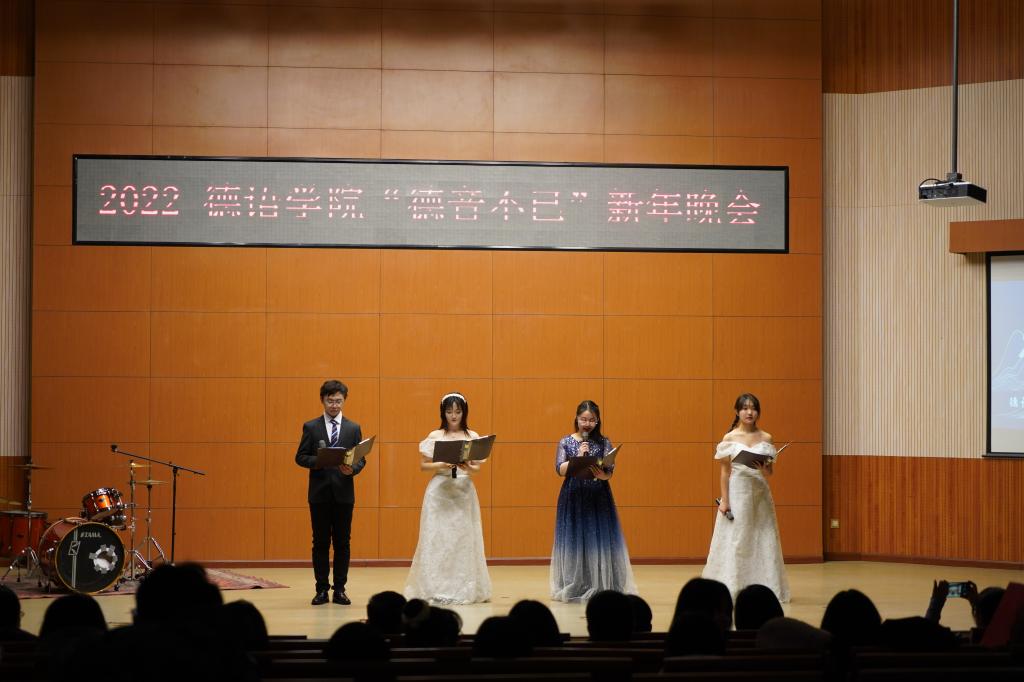 党总支副书记、经理吴江首先发表新年致辞,她用“德忆、德听、德行、德欣、德思、德辩、德音”等七个词总结w88win体育官网入口2021年各项工作,感恩w88win体育官网入口师生们的辛勤付出,向各位老师、同学们送上诚挚的新年祝福!晚会在w88win体育官网入口师生们温馨的新年祝福视频中拉开序幕,w88win体育官网入口老师和同学们各显神通,带来了舞蹈、朗诵、歌曲、电影配音、乐器演奏等节目,精彩纷呈,高潮迭起。