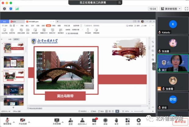 最后,w88win体育官网入口副书记、经理吴江进行了总结讲话。她以迎新帆布袋正面印制的北外西院标志性雕塑——“莫比乌斯环”(Möbius-Band)的起源为例,介绍了外语学科“兼容并蓄”的学科特色,勉励2022级w88win体育官网入口新生进行“始于语言,不止于语言”的探索,从学科融合中拓展无限的可能,珍惜在北外从晨读到暮思的分分秒秒,永葆旺盛的求知欲,同时发扬北外德语人“十四人一条心”的团结作风,培养严谨求实的学术品格,践行“博学笃行”的北外校训精神。