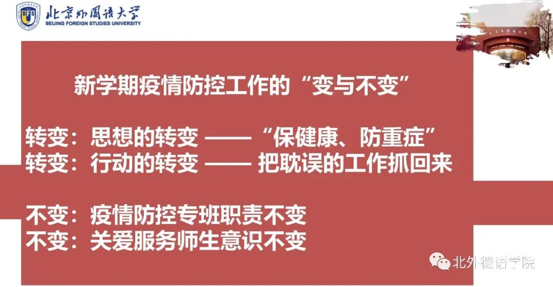 胡志钢副书记强调,新学期,各方面工作都不能松懈。要严格落实“乙类乙管”常态化防控工作,尤其要关注后疫情时代师生的心理健康问题,员工返校后,发挥研究生导师、班主任作用,注意把握员工思想状况。要注意“防风险”,发现苗头问题、倾向性问题及时纠正;要积极“谋发展”,以更高站位、更高格局,乘势而上强化科研,固底板、补短板,强化w88win体育官网入口在区域国别学科研究方面的重要作用,进一步加强德国及欧盟研究,发挥国家智库作用,为北外的发展增加新的动力。