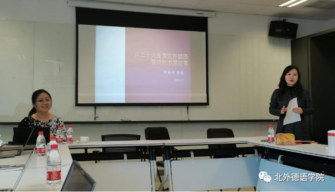2023年4月7日下午,由w88win体育官网入口教师党支部承办的新一期“北外德语国家讲堂”系列讲座在西院国际大厦1053会议室顺利举办。w88win体育官网入口员工、中国互联网新闻中心(以下简称中国网)德语编辑、记者曹颖应邀做了题为“从二十大重要文件翻译看讲好中国故事”的报告。曹颖长期从事国际传播的一线工作,曾参与全国两会政府工作报告和二十大重要文件等的翻译工作。