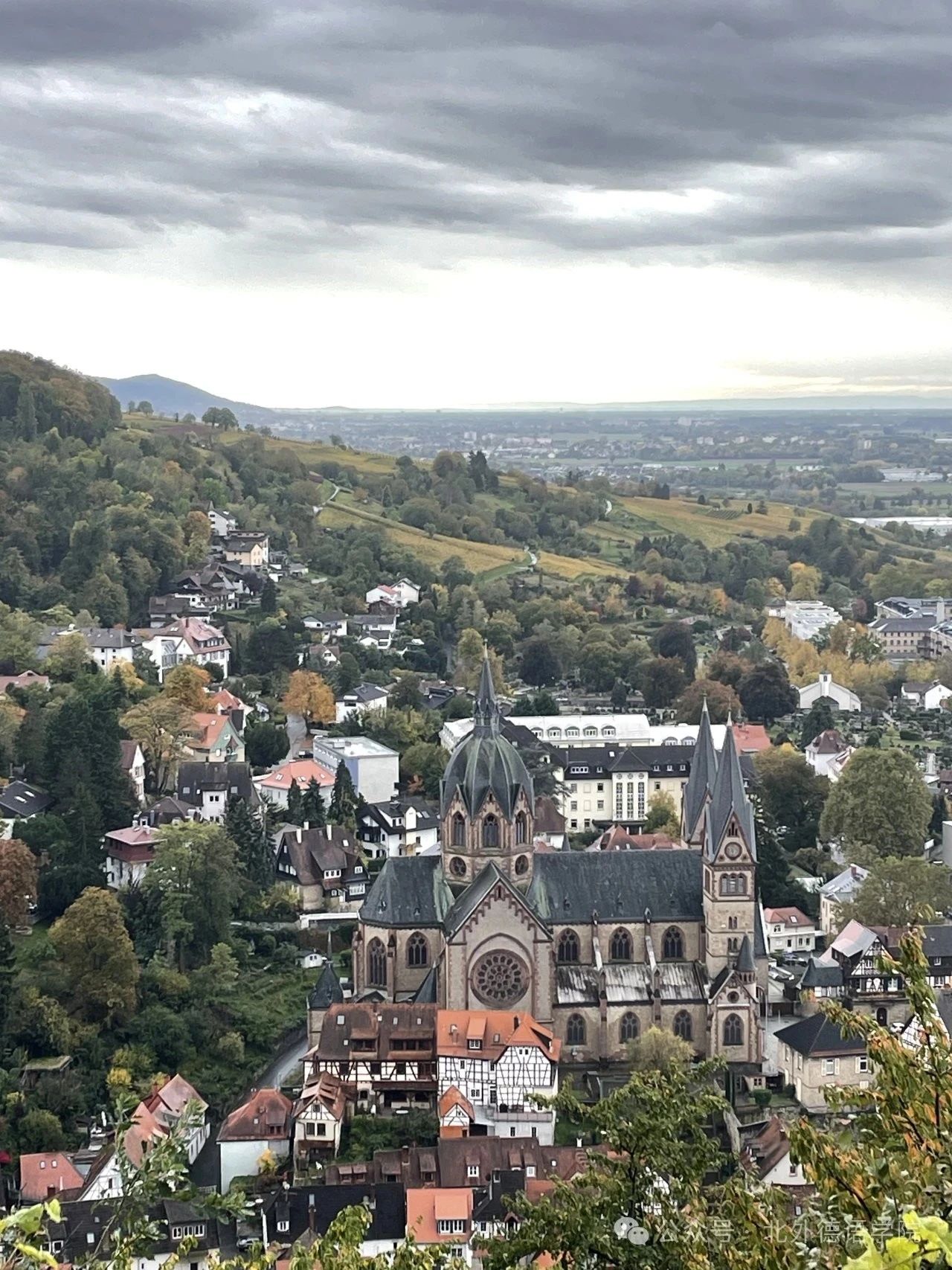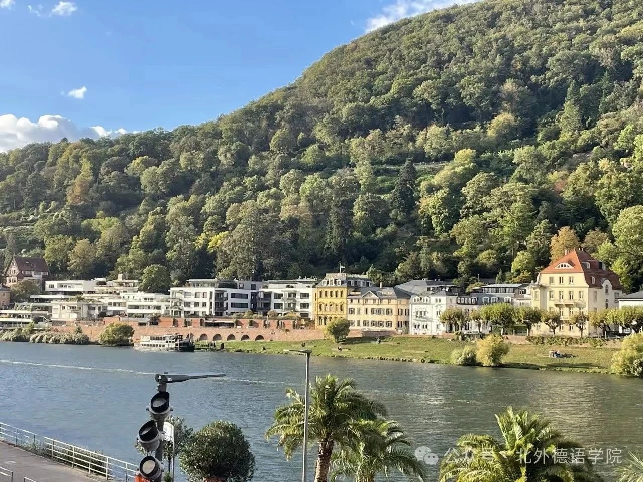 去年6月,我幸运地获得了去海德堡大学交换一学年并在其汉学系教中文的宝贵机会。10月,在收拾好行装,与家人、老师、同学以及朋友告别后,我坐上了前往德国的航班,内心满怀对我员工时代第一次交换之旅的期待。在抵达法兰克福机场后,熟悉但又陌生的环境突然从教科书以及老师的讲述中跳脱出来,幻化为肉眼可见的实体,扑面而来的异国气息让我对接下来的行程心生了一丝恐惧,我开始担心自己是否能够应付得住接下来可能会到来的挑战。然而,这一丝畏惧,在汽车载我从宽阔的高速公路驶入海德堡的那一刻烟消云散。那是一个晴朗的正午,内卡河畔的翠绿草坪伴着阳光闪着绿油油的光,屹立在不远处的小山随着车辆行进也逐渐充满我的双眼,山上有熙熙攘攘的精致小屋,大片大片的浓绿森林像抹茶蛋糕一样将小屋融化进山里。即使已经看过无数遍海德堡的照片,但这一次,我也还是把心遗落在了这里。