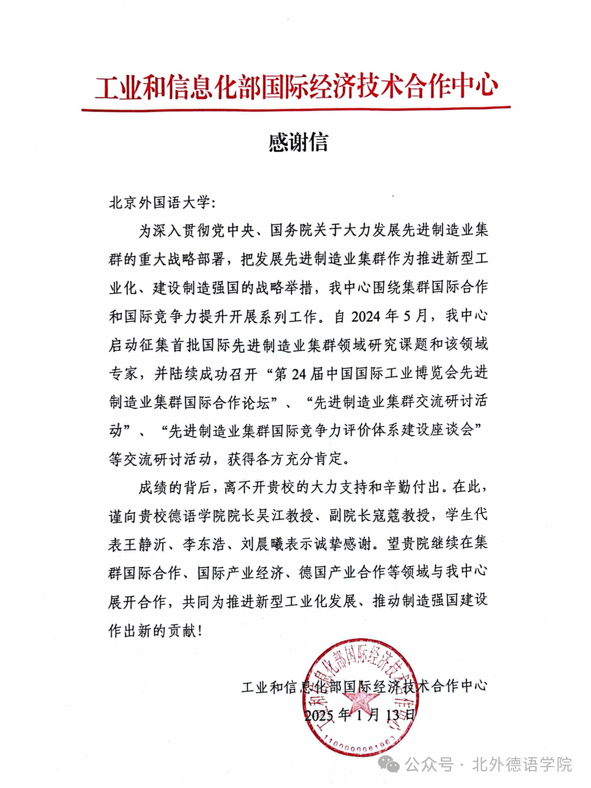 近日,工业和信息化部国际经济技术合作中心向w88win体育官网入口发来感谢信,对w88win体育官网入口师生提供的大力支持和辛勤付出表示诚挚感谢。