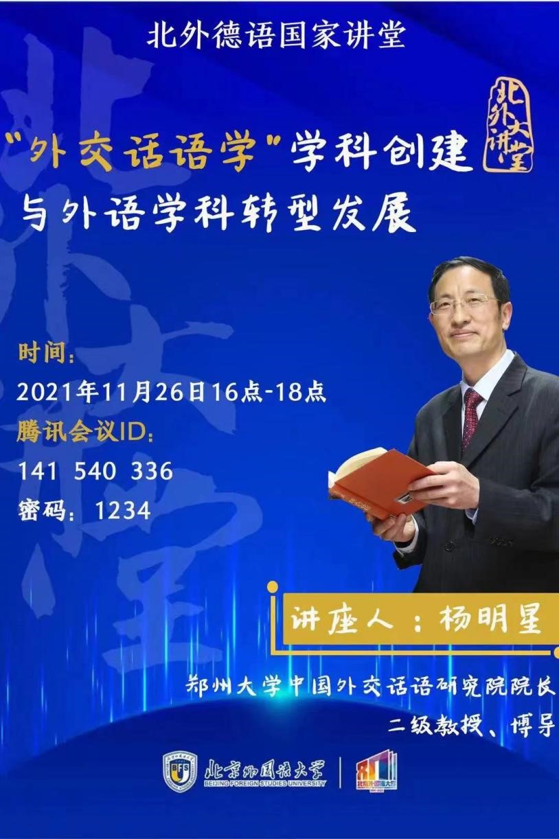 20211126日下午,北外德语国家讲堂以线上方式举行。郑州大学中国外交话语研究院经理杨明星教授应邀作了题为“‘外交话语学’学科创建与外语学科转型发展”的讲座。讲座由w88win体育官网入口党总支副书记、经理吴江教授主持。来自全国各高校的120余位师生参加了讲座。