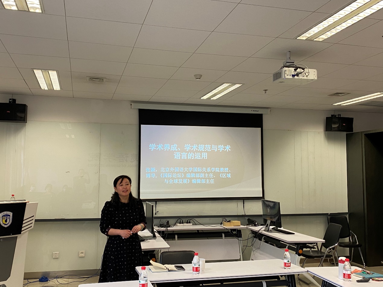 张颖教授担任CSSCI来源期刊《国际论坛》编辑部副主任、《区域与全球发展》编辑部主任,有着丰富的期刊论文编审经验。张颖教授结合自己十余年的期刊编审经历,从编审原则、论文规范和校对规范三个方面讲解了学术论文的写作方法和编审流程。张颖教授指出,好的论文选题应有前瞻性和问题意识,注重思想性、理论性和创新性,能够用严密的论证支撑论文的观点。国际关系类论文应有新观点、新角度或新材料,注意热点与现实的结合。此外,张颖教授还从标题规范、段落写作、句子写作、词语适用、摘要规范等角度细致地介绍了论文写作和学术语言运用的方法。
