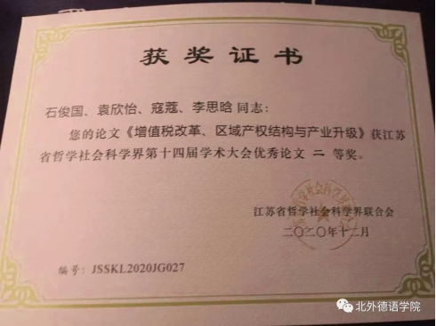 祝贺w88win体育官网入口讲师寇蔻博士与石俊国(江苏大学)、袁欣怡(东北大学秦皇岛分校)以及李思晗(西班牙瓦伦西亚理工大学)共同撰写的论文《增值税改革、区域产权结构与产业升级》获江苏省哲学社会科学界第十四届学术大会优秀论文二等奖!