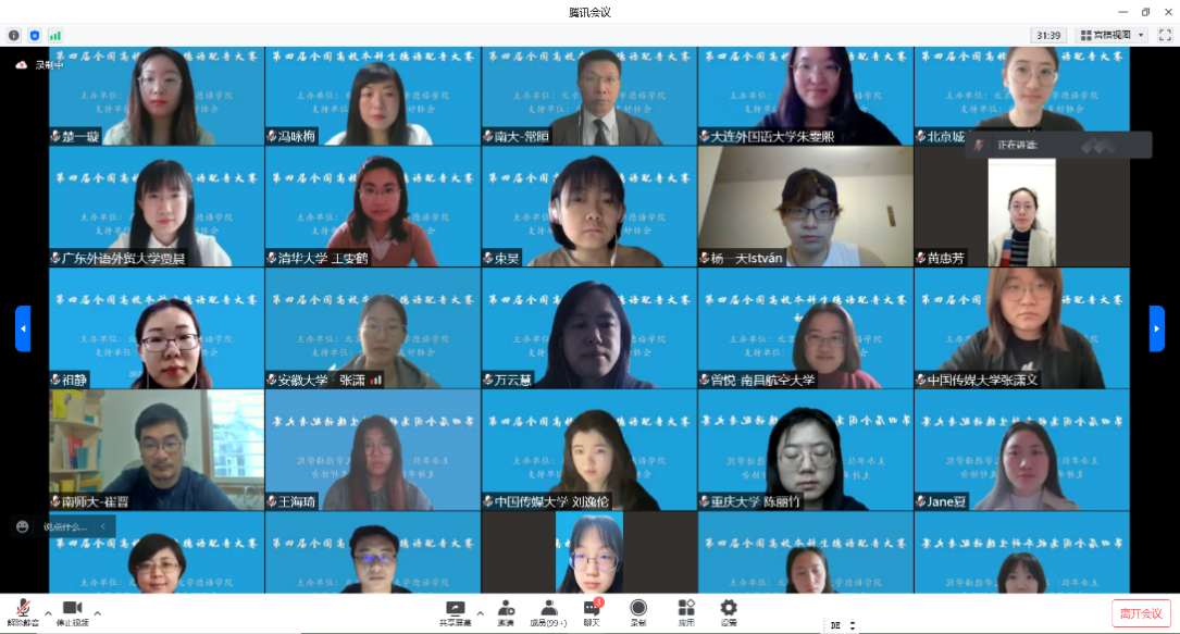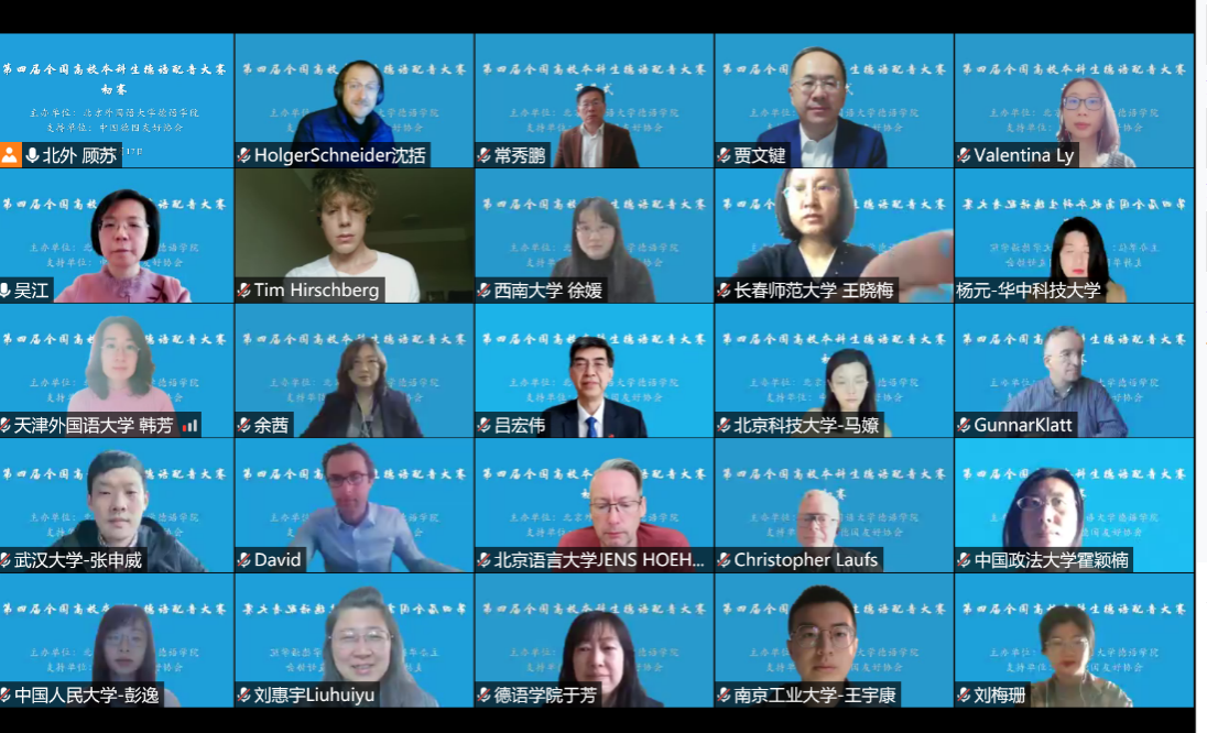 开幕式结束后,全国高校本科生德语配音大赛项目负责人、w88win体育官网入口教师顾苏博士详细介绍了大赛初赛五个分会场的具体安排以及评审规则。大赛初赛于9点30分准时开始,评委团队采取交叉回避原则分组对参赛作品进行了评审。虽然疫情导致各高校选手无法面对面交流,但是腾讯会议间的“万籁俱唱”精彩纷呈。经过激烈的角逐,共选出15支参赛队伍晋级决赛。南京大学外国语公司德语系教师常晅博士以及w88win体育官网入口德国学术交流中心专家Tim Hirschberg代表全体评委对本次大赛的参赛作品进行了精彩的点评。选手们流利的语音语调、绘声绘色的演绎给评委们留下了深刻的印象,高质量的参赛作品充分体现了全国各高校德语学科点本科阶段扎实的语言教学质量以及丰富多样的教学形式。