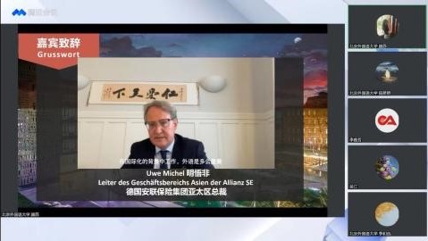 德国安联保险集团亚太区总裁明悟非(Uwe Michel)以及中德安联人寿保险有限公司执行董事、总经理徐春俊以视频方式发来祝贺,表示语言和友谊密不可分,语言、文化和艺术是跨越时空的桥梁。中国和德国各自具有丰厚的文化底蕴,两国人民有着悠久的友好交往传统。希望中国年轻学子们通过学习德语和欣赏德国影视作品来了解德国文化,期待更多的年轻德语人为中德友谊添砖加瓦。