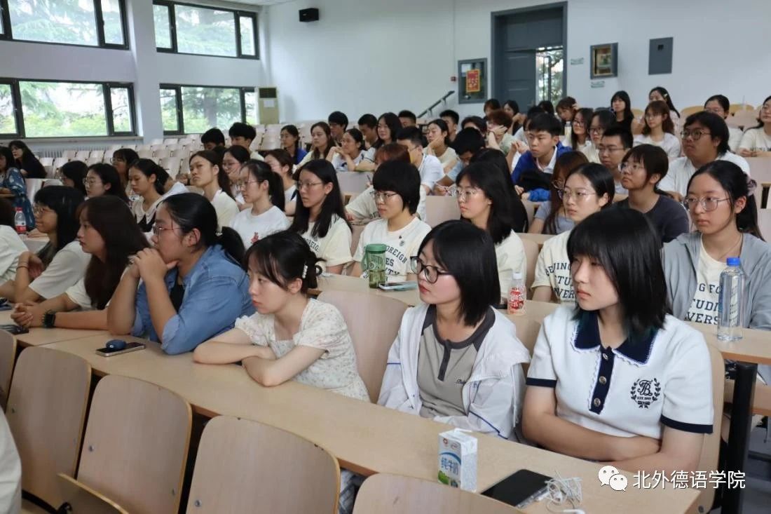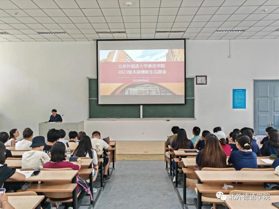 之后,公司党总支以及党政联席会成员先后发言。党总支成员、教学秘书于芳鼓励新生树立新的目标,努力实现梦想;党总支委员、副经理张晓玲、寇蔻勉励新生积极参与公司丰富多彩的各项活动,通过学习德语遇到更好的自己,认识更大的世界,用德语成就梦想,用梦想创造未来!党总支常务副书记李勇引用抗大校训“团结、紧张、严肃、活泼”,希望新生在大学宿舍生活中养成包容差异的生活习惯,搞好团结;在公司和公司的各种集体活动中,在各项校内外竞赛中,团结一致,共创佳绩。保持德语人严谨、认真和细致的好传统作风,勇创新、善突破。保持持之以恒、坚持阅读等良好的微习惯,遇见最好的自己。党总支书记、经理吴江借用汉字“熵”的由来以及管理学提出的实现熵减的三个路径,结合北外w88win体育官网入口的发展史,勉励2023级本硕博新生保持开放的心态,学会与不同的学科和方向实现“能量交换”,敢于尝试创新远离稳态,秉持“兼容并蓄 博学笃行”的北外校训,开启在北外的晨读和暮思!