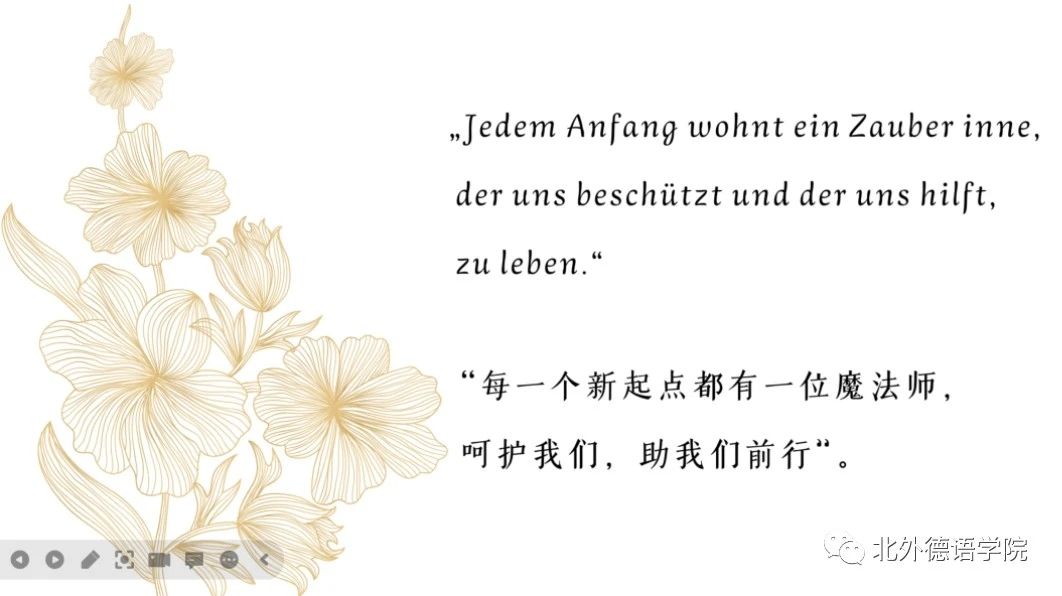徐四季、李婧和陆娇娇作为教研室主任代表发言,勉励新生勇敢做自己,从北外出发,走向德语国家,在中欧交流的大舞台贡献自己的力量,祝福新生在北外沐浴四季阳光,播撒梦想的种子,合理规划好时间,充分培养兴趣与才干,不负韶华,静待花开;葛囡囡、史良作为班主任代表发言,鼓励新生寻找互帮互助的朋友,结识志同道合的伙伴,在模仿和超越榜样的过程中塑造出独特的自我;洪堃绿、武迪作为青年教师代表发言,祝福新生在北外w88win体育官网入口度过充实美好的多彩时光,学有所成,开启行走世界的人生新篇章!包葛耿、邱袁炜代表公司行政工作人员发言,希望新生在北外的日子过得开心,每天进步一点点;辅导员张春霞、张婧、黄唯城勉励新生珍惜青春年华,勇攀学业高峰,敢于行走世界,秉承红色基因,成为又红又专又雅的北外德语人,承担起中华民族伟大复兴、构建人类命运共同体的重任。