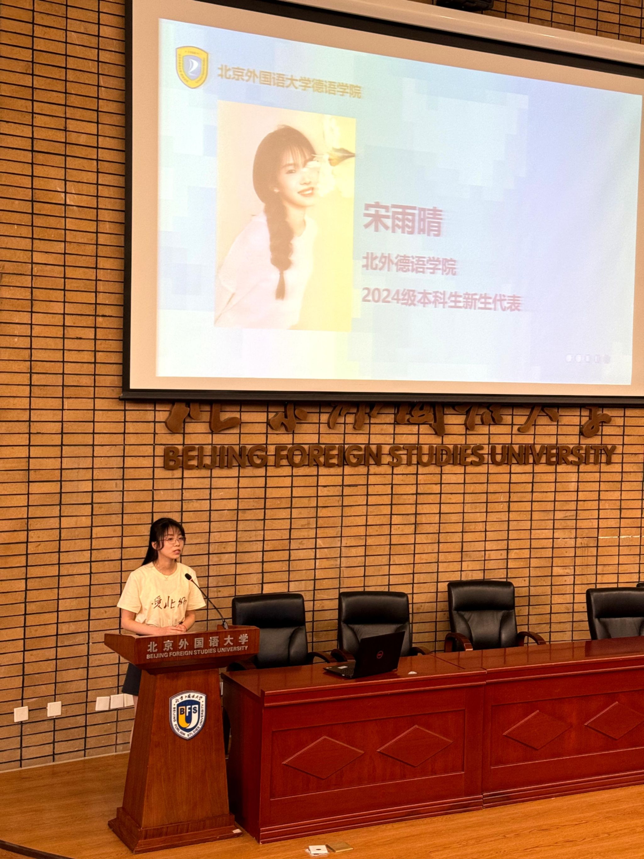 2024级本科新生代表宋雨晴同学从收到录取通知书的喜悦讲起,谈到当今局势和未来发展,强调了w88win体育官网入口人的历史使命。她表示,大家怀揣着对外语的热爱相聚于此,未来更应风雨兼程、共创辉煌。