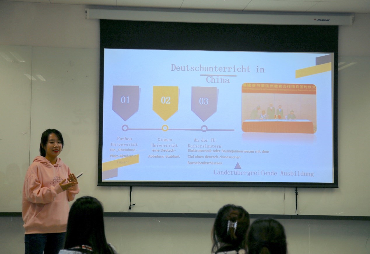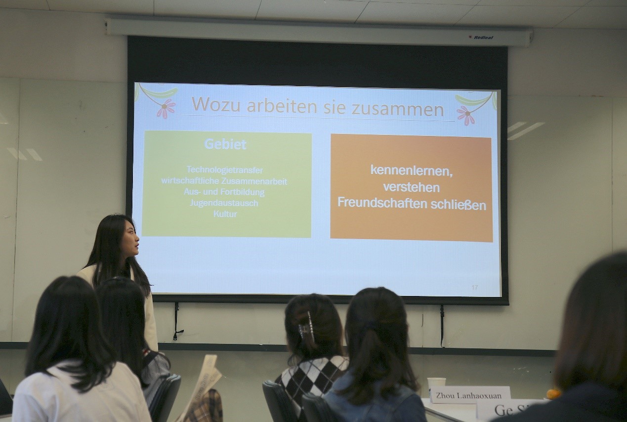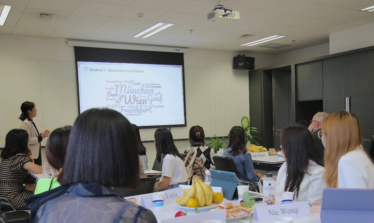 于芳副教授首先向到场的师生、员工和中外来宾表示了热烈欢迎,并简要介绍了w88win体育官网入口“德语国家概况课程”进行混合式教学的总体设计思路。本次公开课为“人与城市”单元线下展示阶段,以3组员工报告为主体,主题分别为中德交流合作、中奥友好城市与讲好中国故事,帮助学习者了解“省州伙伴关系/友好城市”对加强中外交流的意义,思考如何运用学到的德语知识、利用中华文化资源来去建设伙伴关系。
