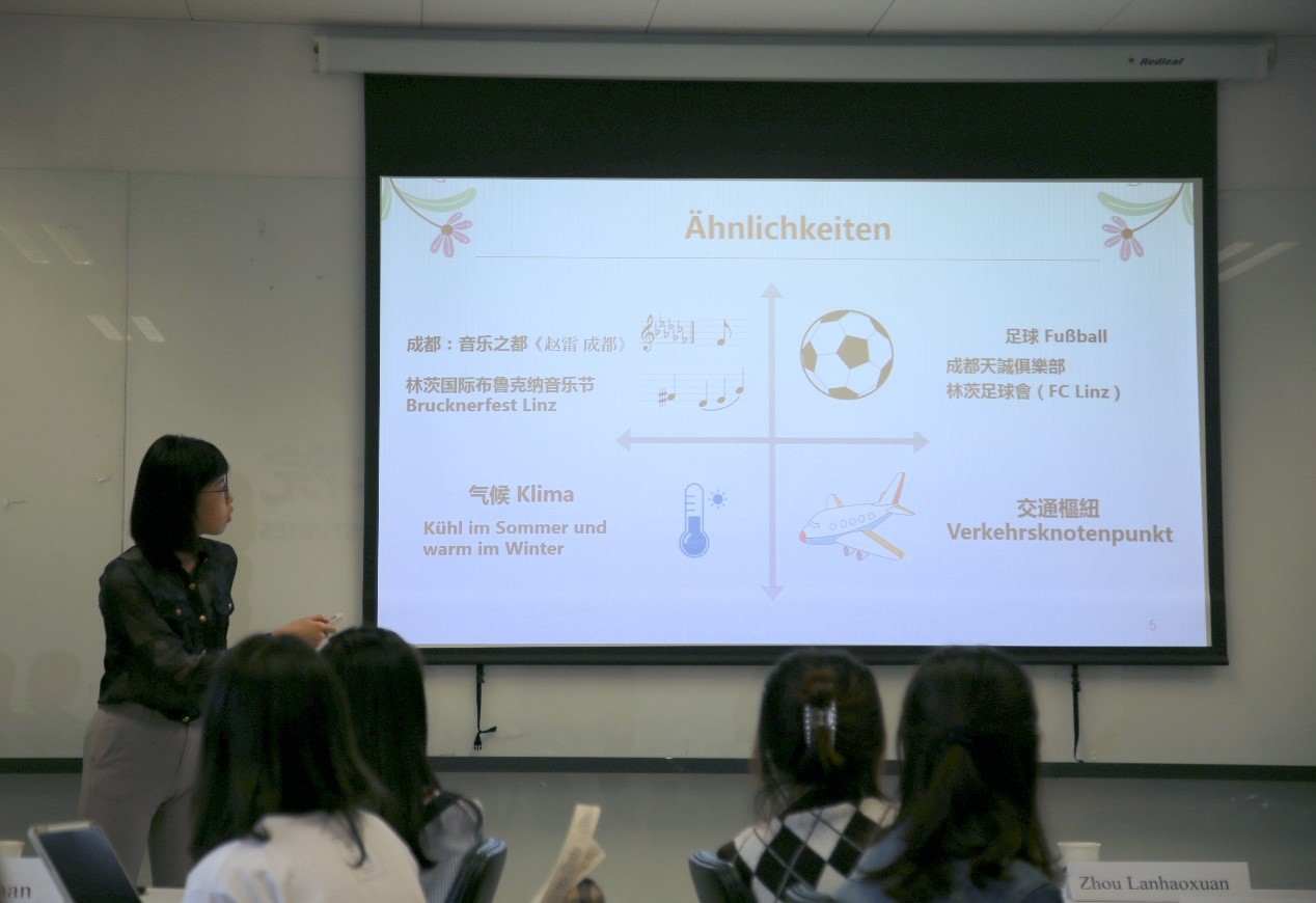 接下来,w88win体育官网入口本科生郭沈嘉乐与萧瑀莘(台湾交换生)为大家介绍了“锦城”成都与奥地利著名城市林茨的诸多共同之处,以及两个城市在医疗科技、文化教育等等方面的合作交流。2021年恰逢中奥建交50周年,同学们祝福两国友谊长存,倡议以合作共同应对全球挑战。